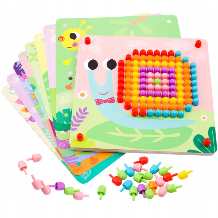 Фантастичний пазл для найменших дітей стимулюватиме їхню творчість. Дошки з барвистими малюнками мають місця для різнокольорових шпильок, які прикрасять витвір мистецтва та завершать малюнок. Створюйте гарний мушлю равлика або різнокольорову луску риби, навчаючись акуратності та терпінню. Іграшки від відомої компанії Tooky Toy призначені для самих маленьких дітей і виготовлені з повністю натуральних, біорозкладних і гіпоалергенних матеріалів, що робить їх на 100% безпечними і нешкідливими не тільки для навколишнього середовища, але і для вашої дитини.